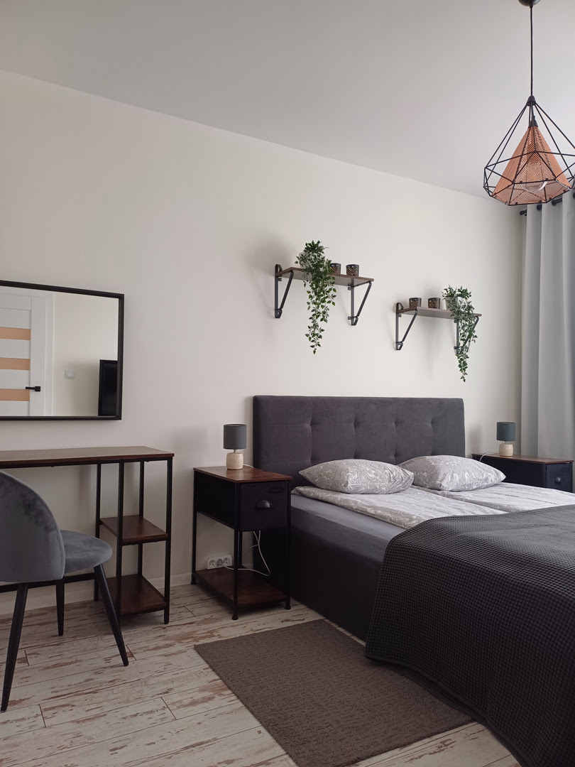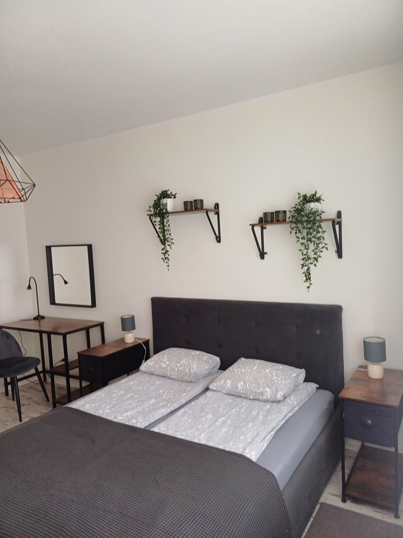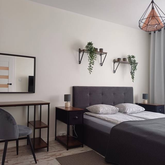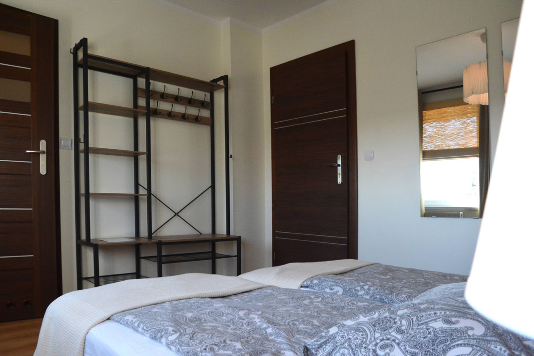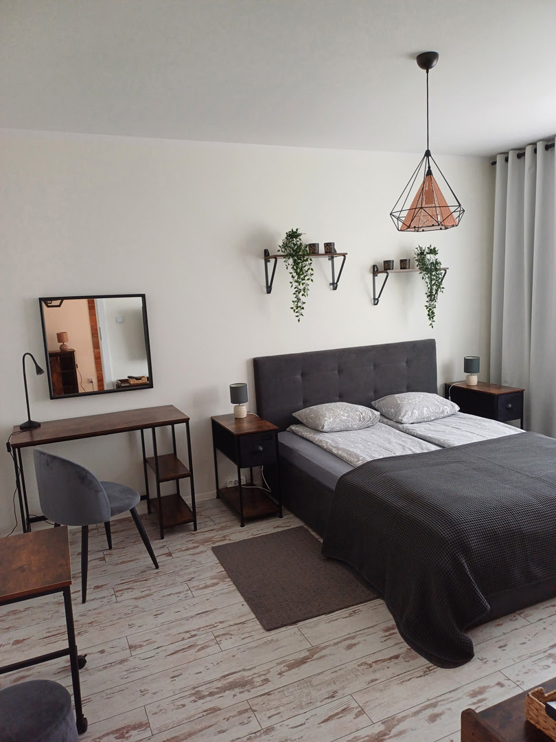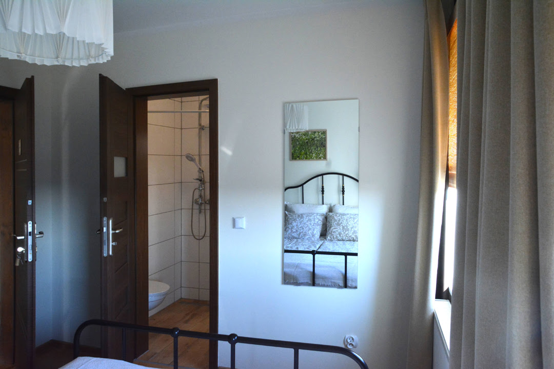 Wyposażenie pokoju: jedno podwójne łóżko, pościel z poszewkami, narzuty, szafki nocne, lampki nocne, toaletka z lustrem, telewizor, szafa otwarta, bezprzewodowy dostęp do internetu.