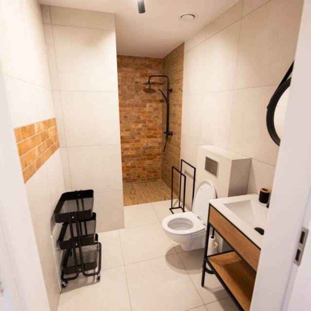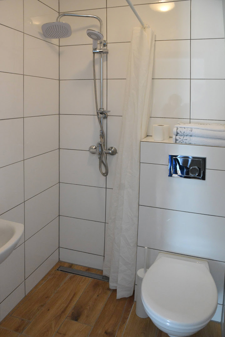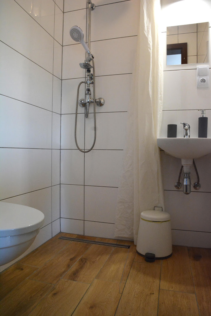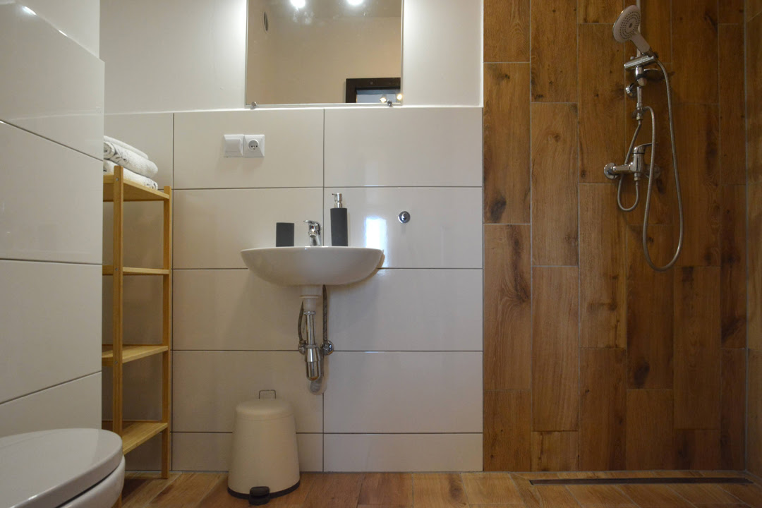 Wyposażenie łazienki: toaleta, umywalka, prysznic, ręczniki.