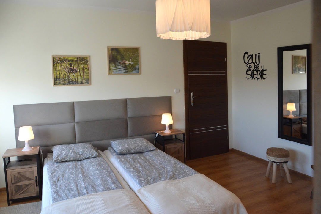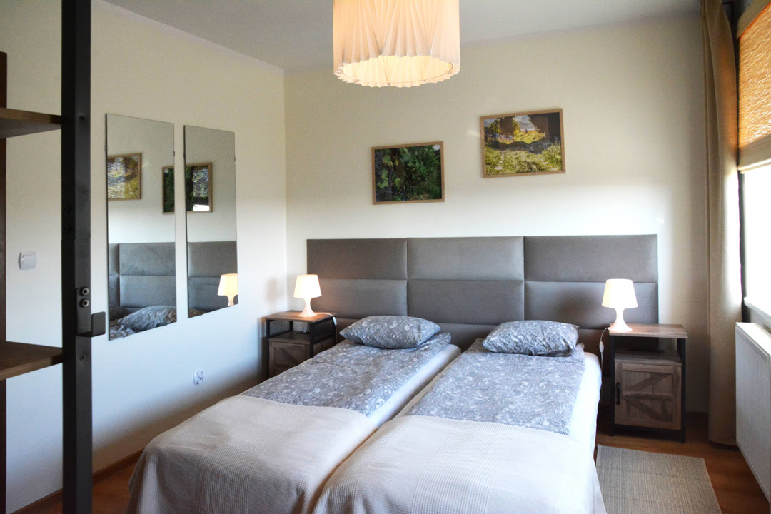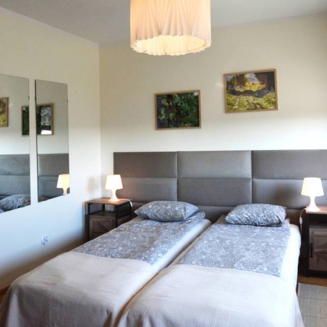Wyposażenie pokoju: dwa pojedyncze łóżka złączone w jedno duże podwójne łóżko z możliwością rozsunięcia, pościel z poszewkami, narzuty, szafki nocne, lampki nocne, szafa otwarta, lustro, bezprzewodowy dostęp do internetu.
