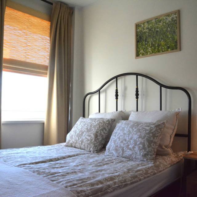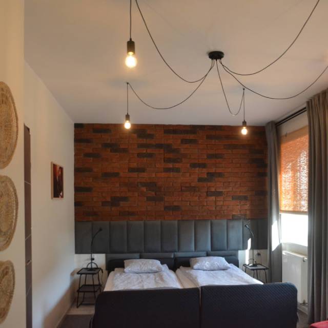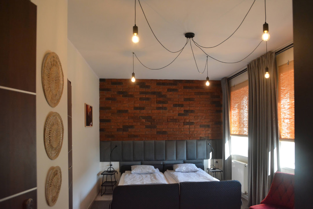 Wyposażenie pokoju: jedno duże podwójne łóżko bez możliwości rozsunięcia, pościel z poszewkami, narzuty, szafka nocna, lampka nocna, szafa otwarta, lustro, bezprzewodowy dostęp do internetu.