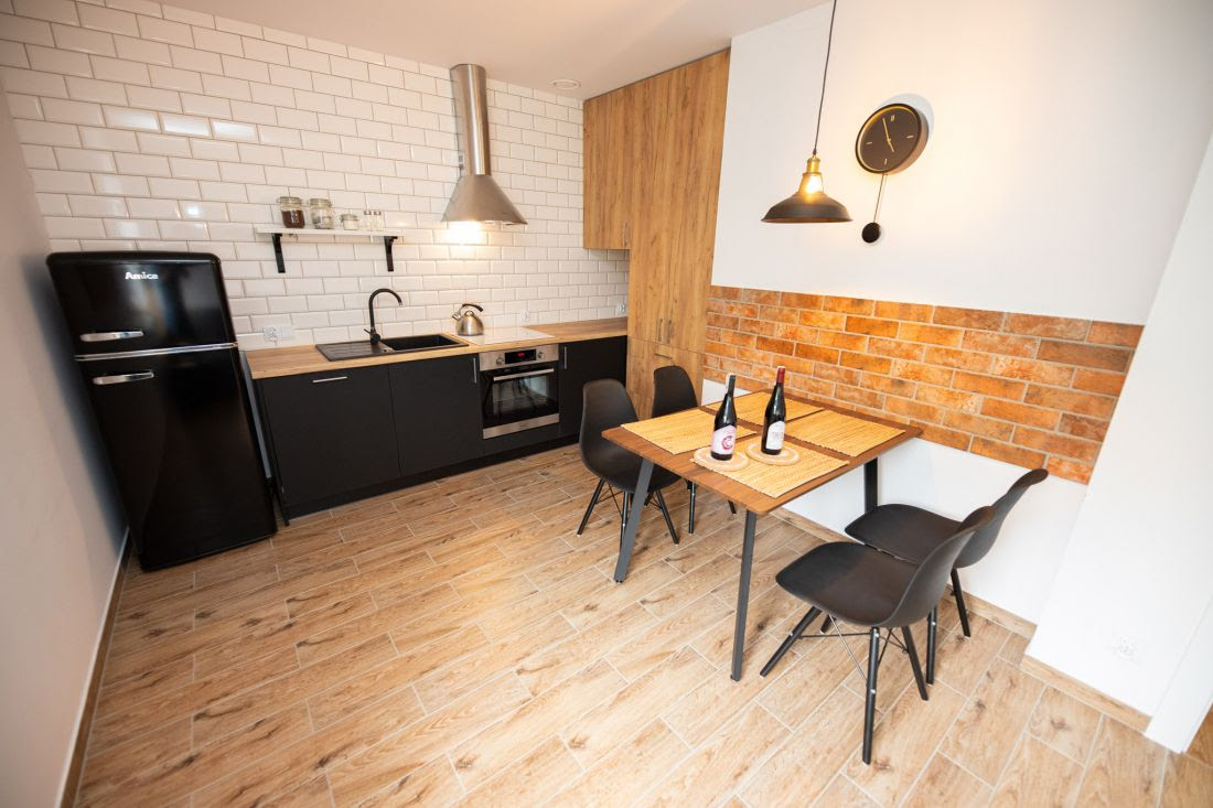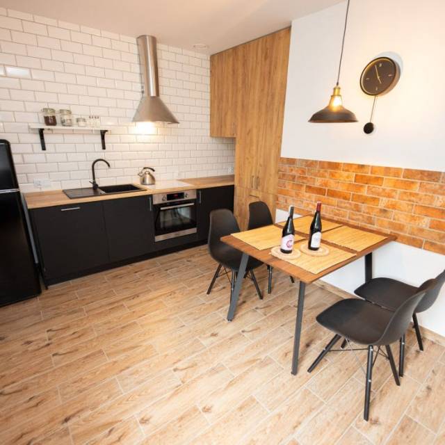 Wyposażenie kuchni: w pełni wyposażona kuchnia w naczynia, czajnik elektryczny, mikrofalówka, lodówka, płyta indukcyjna, zmywarka, piekarnik, zlew, stół i 4 krzesła, stolik kawowy + rozkładana kanapa dla dwóch osób.