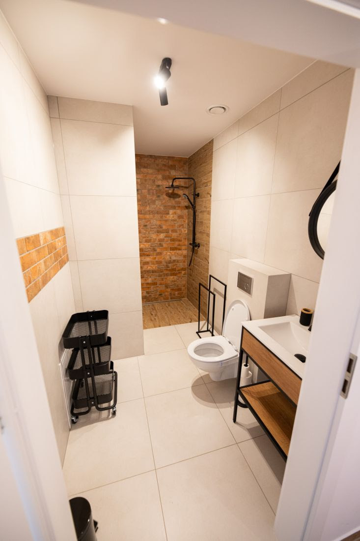 Wyposażenie łazienki: toaleta, umywalka, kabina prysznicowa, ręczniki.
