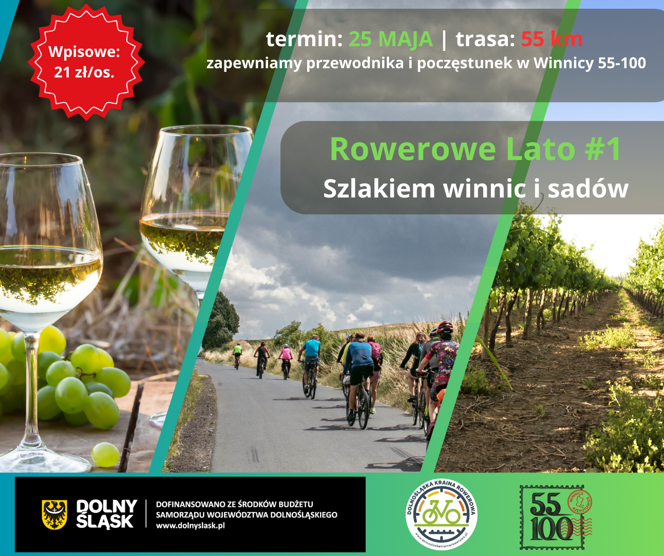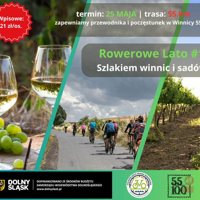 Trasa liczy 57 km i prowadzi pośród licznych lokalnych winnic i sadów, z których słyną gminy Trzebnica, Wisznia Mała czy Zawonia. Wiele ciekawostek o tradycjach winiarskich i sadowniczych opowie lokalny przewodnik Daniel Buczak, którego będzie wspierała Ania Hupa. Na zakończenie wycieczki zaplanowaliśmy poczęstunek w jednej z nich - Winnicy 55-100 w Rzepotowicach, zwiedzanie winnicy, poczęstunek z grilla, zimne napoje.