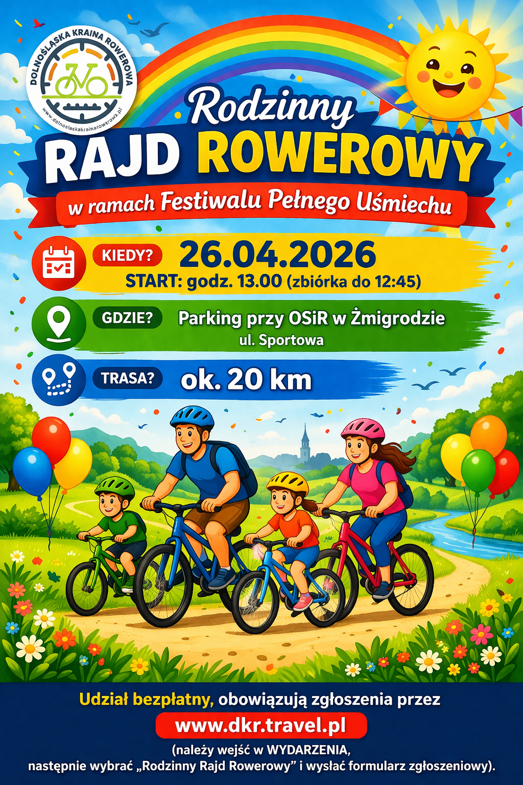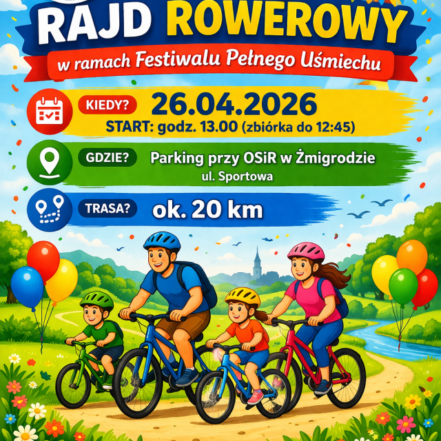 więcejSerdecznie zapraszamy do udziału w rodzinnym rajdzie rowerowym wokół Żmigrodu, który odbywa się w niedzielę 26 kwietnia, w ramach wydarzenia "Piknik Pełen Uśmiechu", trwającego na żmigrodzkim rynku od piątku 24 kwietnia do niedzieli 26 kwietnia.