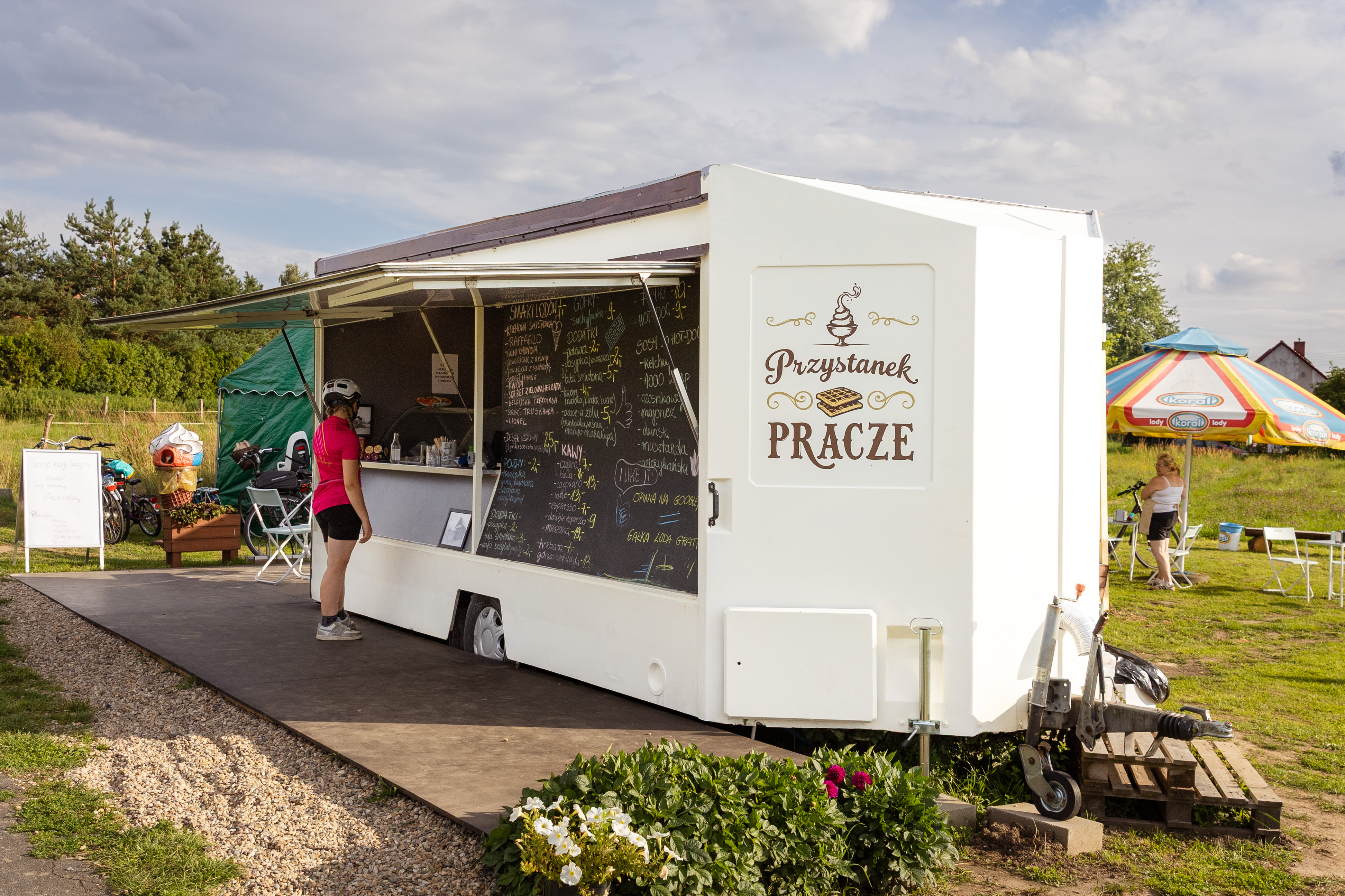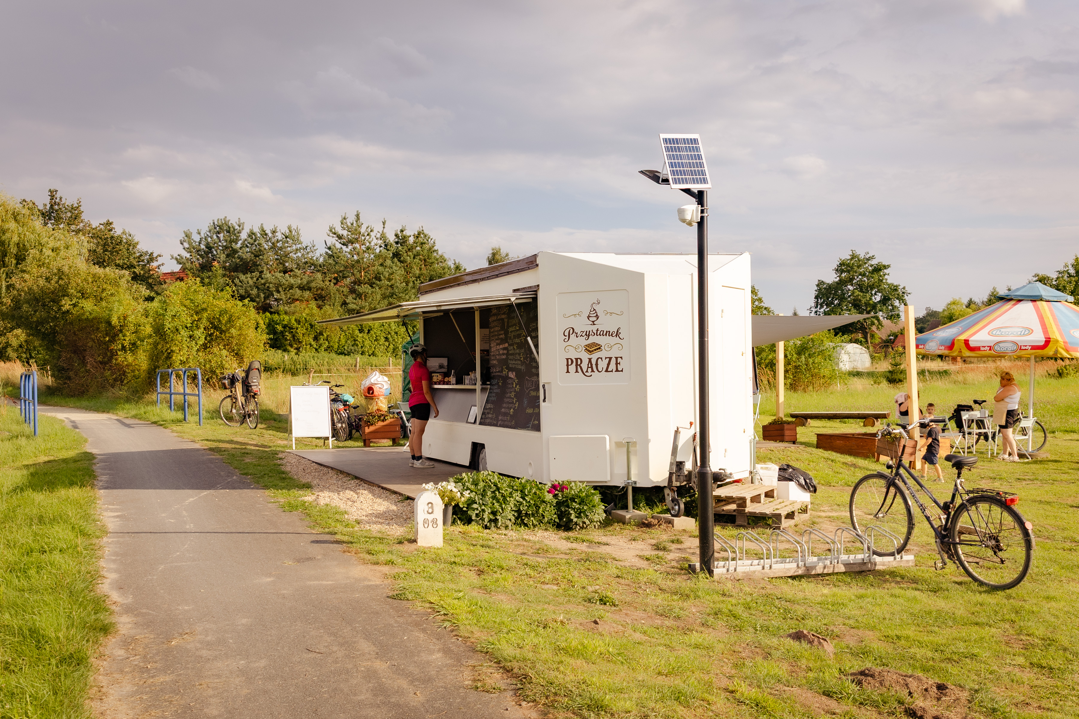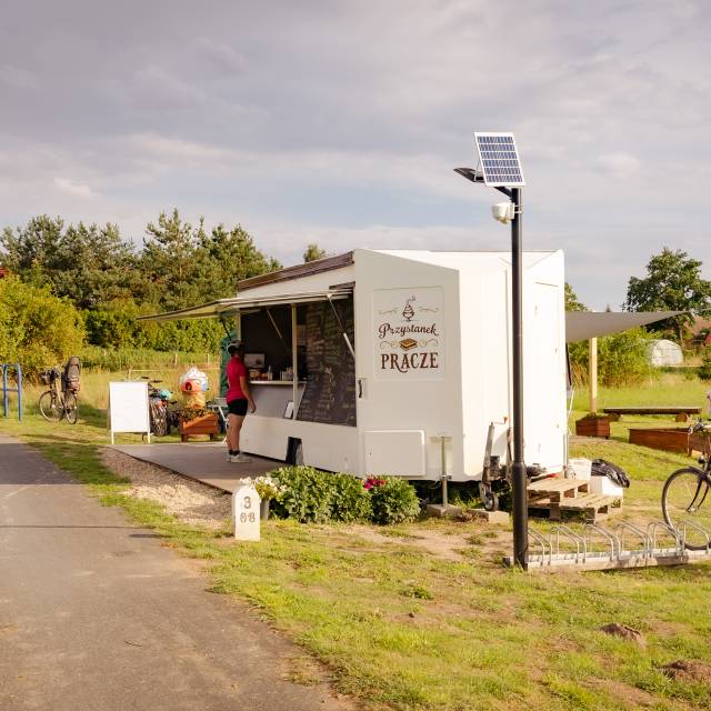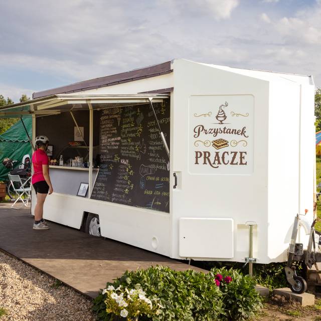 Oferta gastronomiczna sezonowa (food truck), zlokalizowana bezpośrednio przy drodze rowerowej trasą dawnej kolejki wąskotorowej, na wysokości wsi Pracze.
