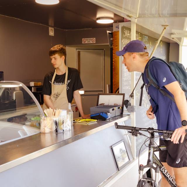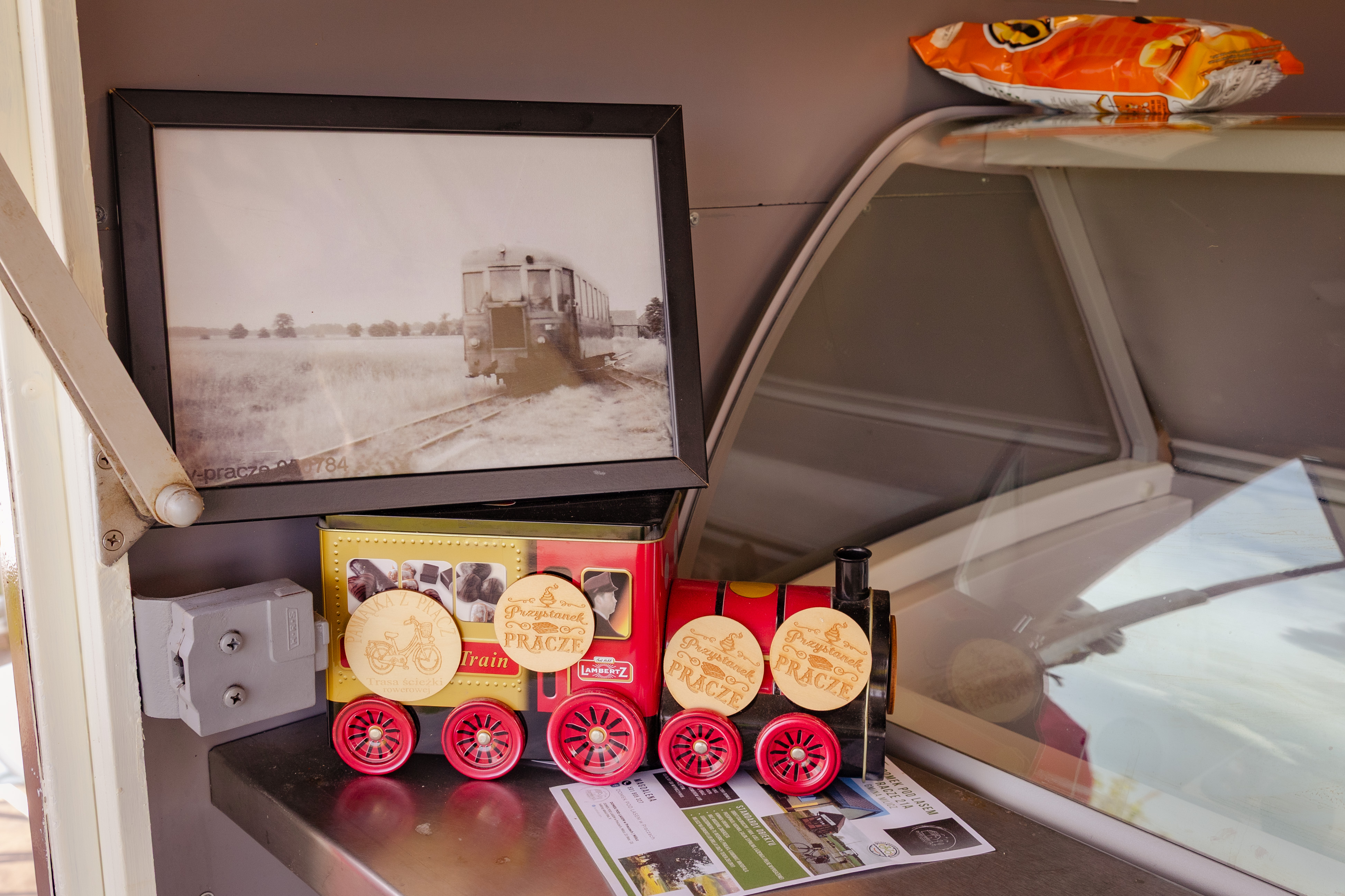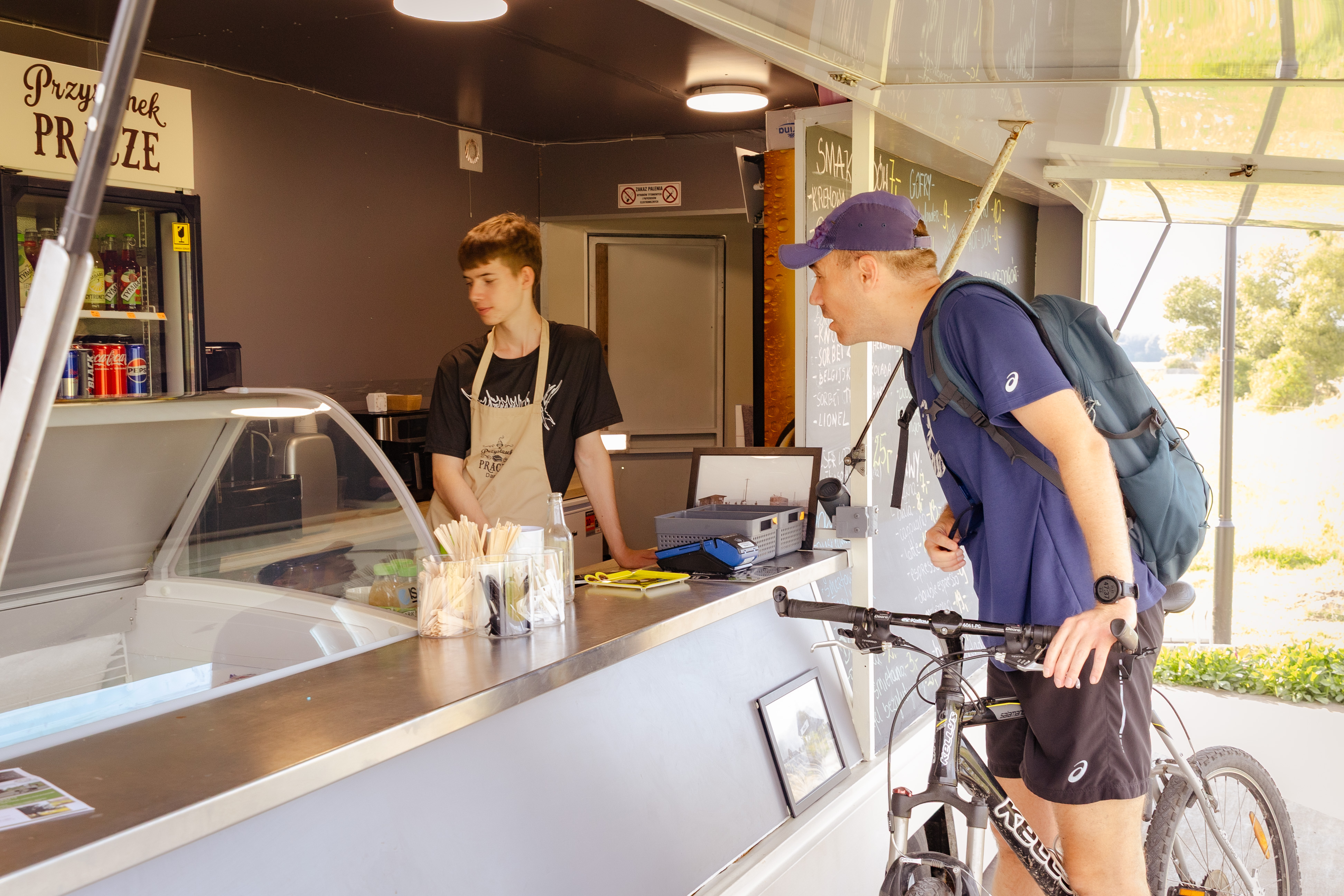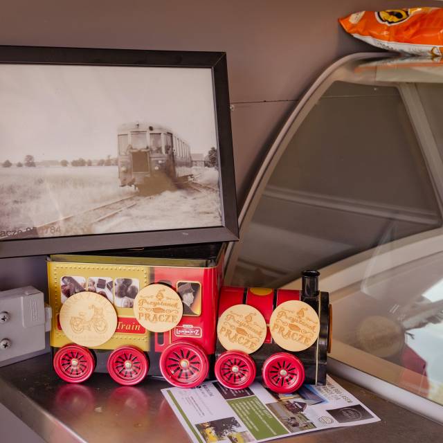 Oferta gastronomiczna sezonowa (food truck), zlokalizowana bezpośrednio przy drodze rowerowej trasą dawnej kolejki wąskotorowej, na wysokości wsi Pracze.