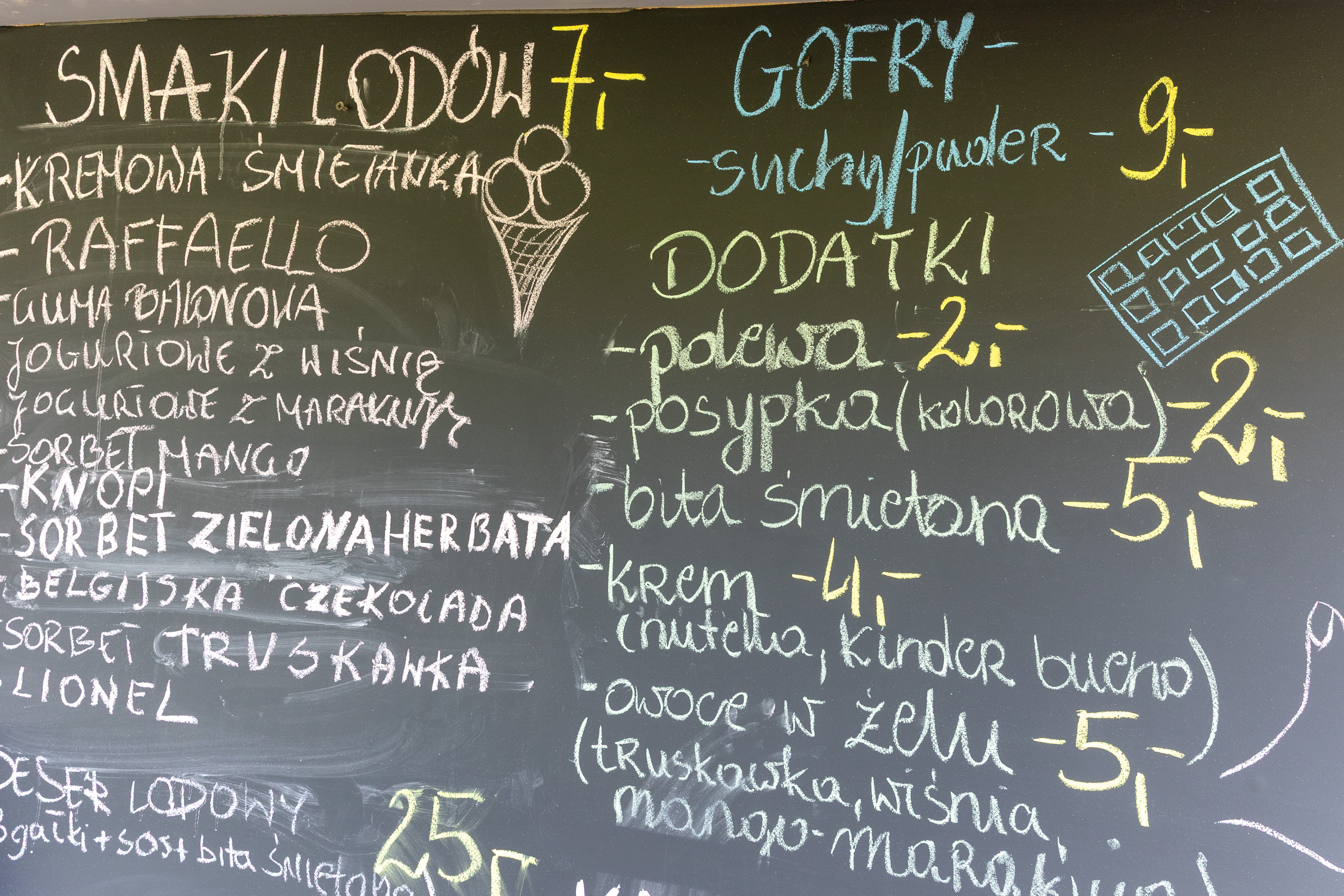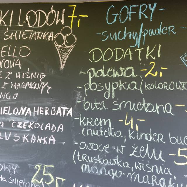 W ofercie przekąski słodkie i wytrawne (lody, gofry, hot-dogi, frytki), na ciepło i na zimno oraz napoje ciepłe i zimne.