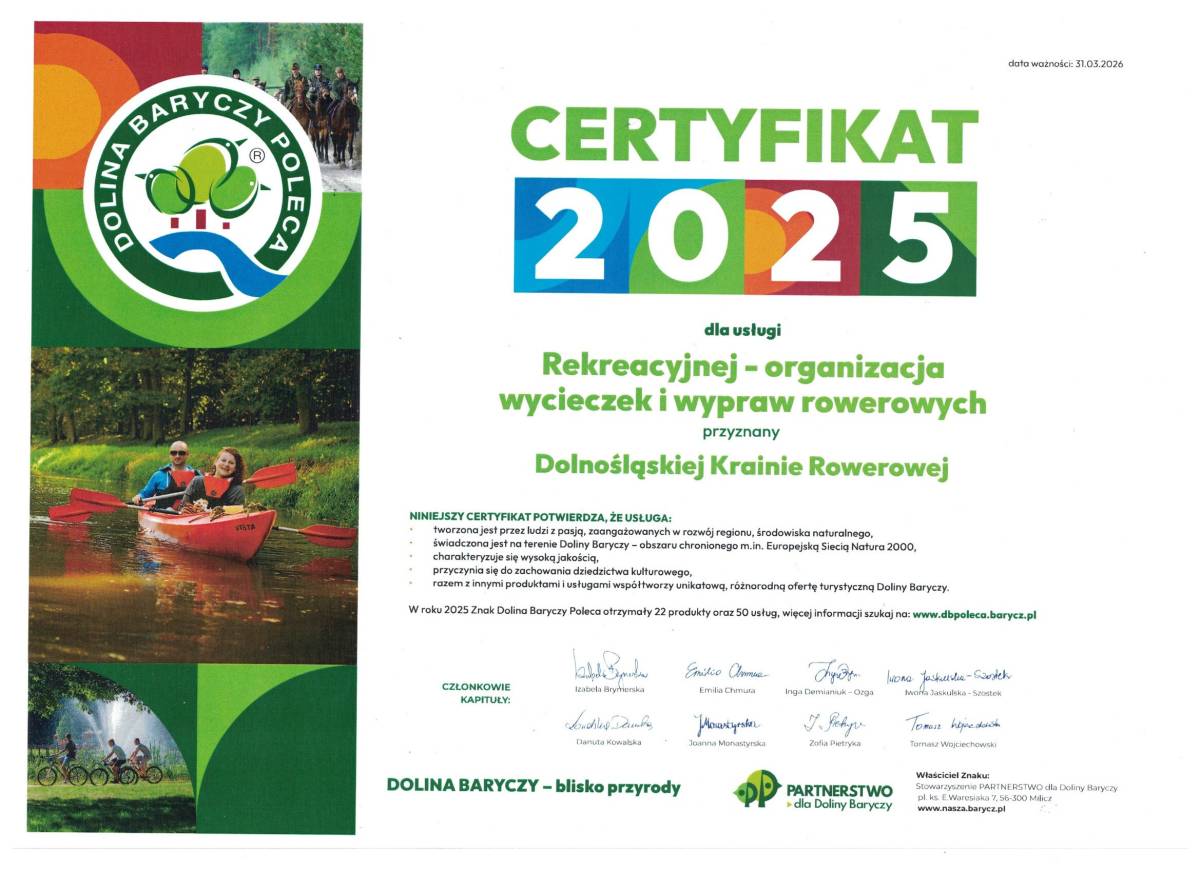 CERTYFIKAT "DOLINA BARYCZY POLECA" dla naszych usług rekreacyjnych: